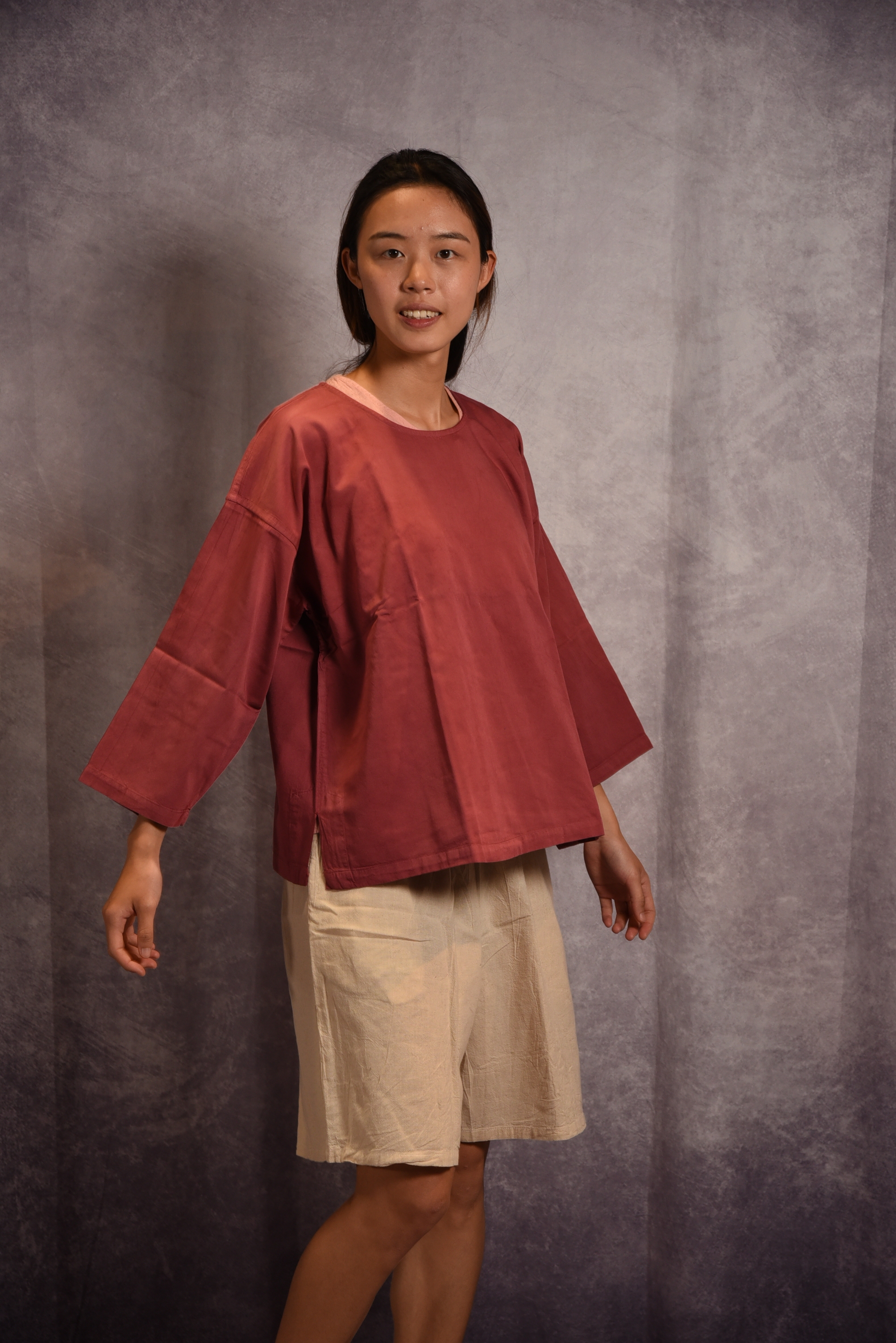 相較於角衣,圓衣修了四個尖角,多了圓滑還有柔順感,相較於角衣的張力,更顯示出女性的溫柔婉約。七分袖的設計防曬透風。夏季炎熱在戶外可捲成短袖,秋季漸涼可放下袖子,繫上圍巾即可保暖。